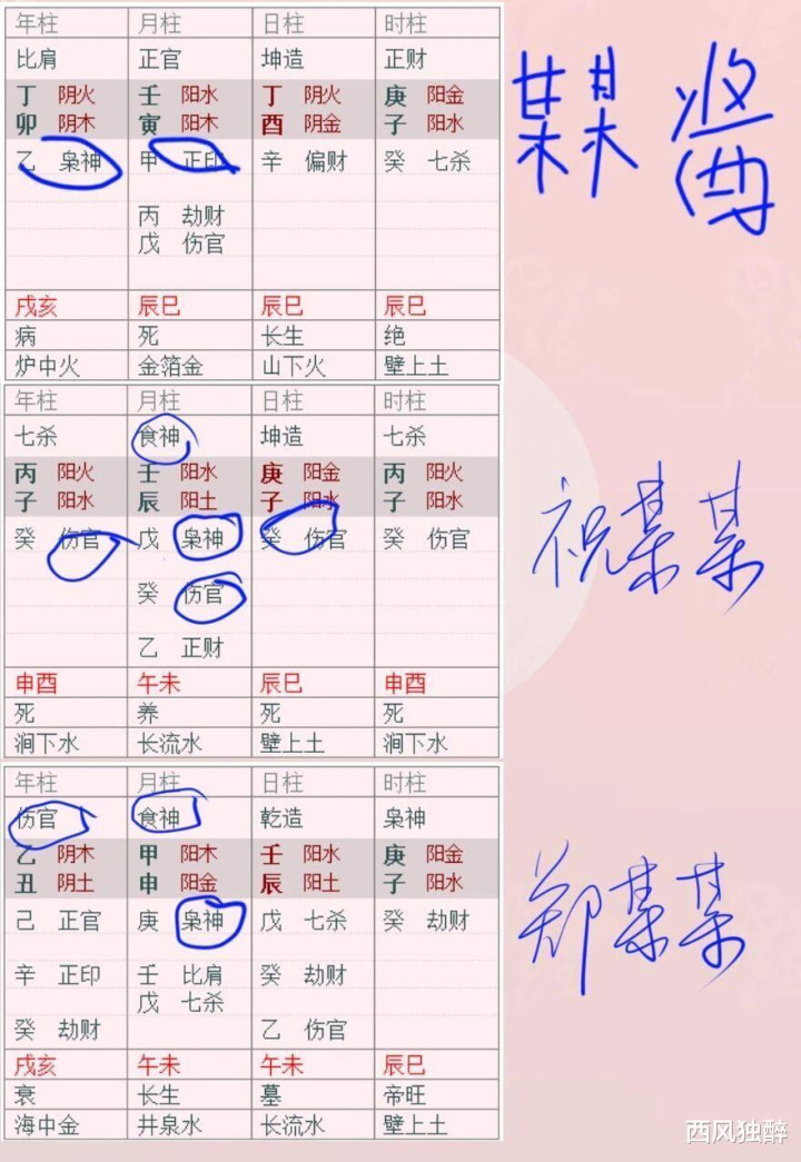 2. 除了某哥、祝某某七杀透干,某某酱正官透干(月令正印),郑某某食伤透干(月令偏印)外,其他均为印星透干。其中,董某某为正印通根透干,其他为偏印透干。